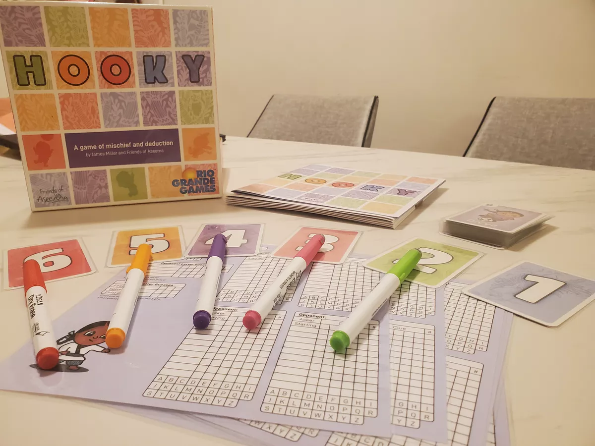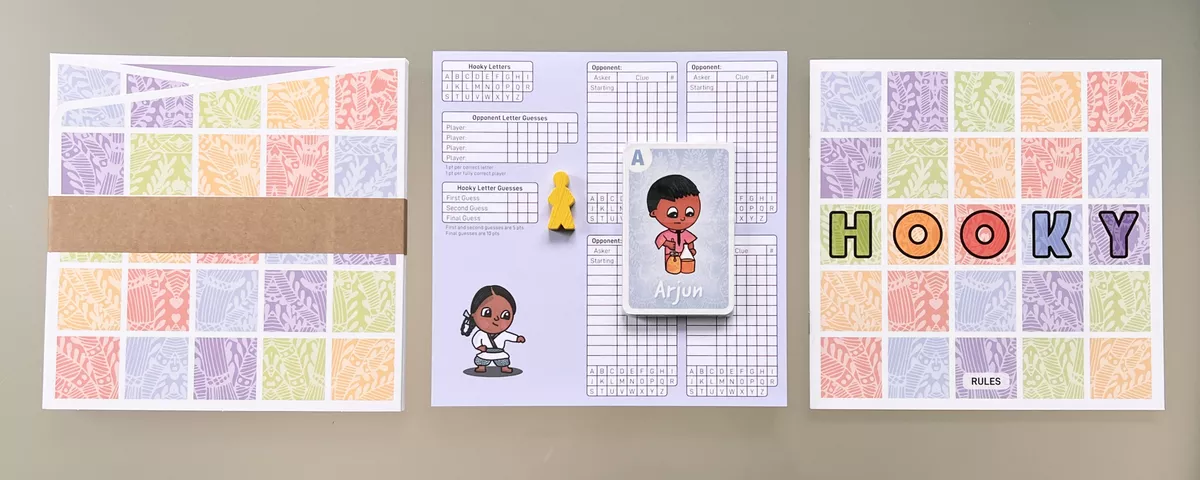 Se barajan las 26 cartas de letra (A–Z). Tres cartas se dejan boca abajo como cartas de Hooky (los alumnos que faltan) y el resto se reparte entre los jugadores, que sabrán qué estudiantes sí están en el cole.🔠 Haz preguntas con palabras de 5 letras: