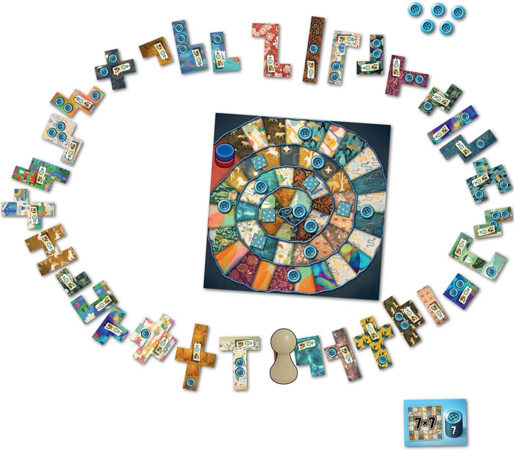 Ser quien consiga la colcha más eficiente y valiosa, llenando la mayor parte posible de tu tablero 9×9 mientras acumulas más botones que tu rival. Al final de la partida, tus puntos son: