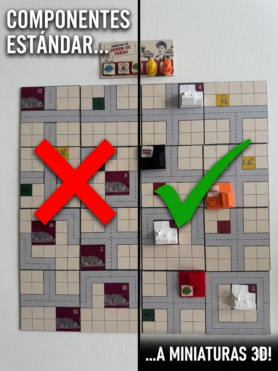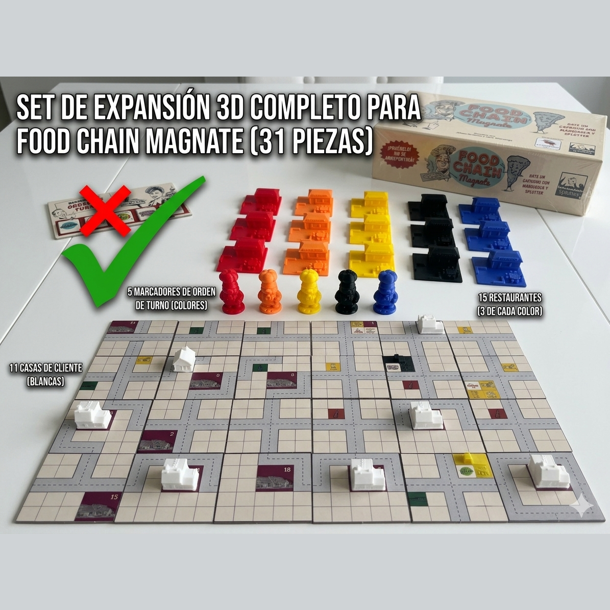 Este accesorio incluye casas para los clientes, restaurantes para los jugadores y marcadores de orden de turno para darle al juego una presencia en mesa mucho más llamativa. Es perfecto para quienes disfrutan personalizar sus juegos y convertir cada partida en una experiencia más inmersiva y premium.