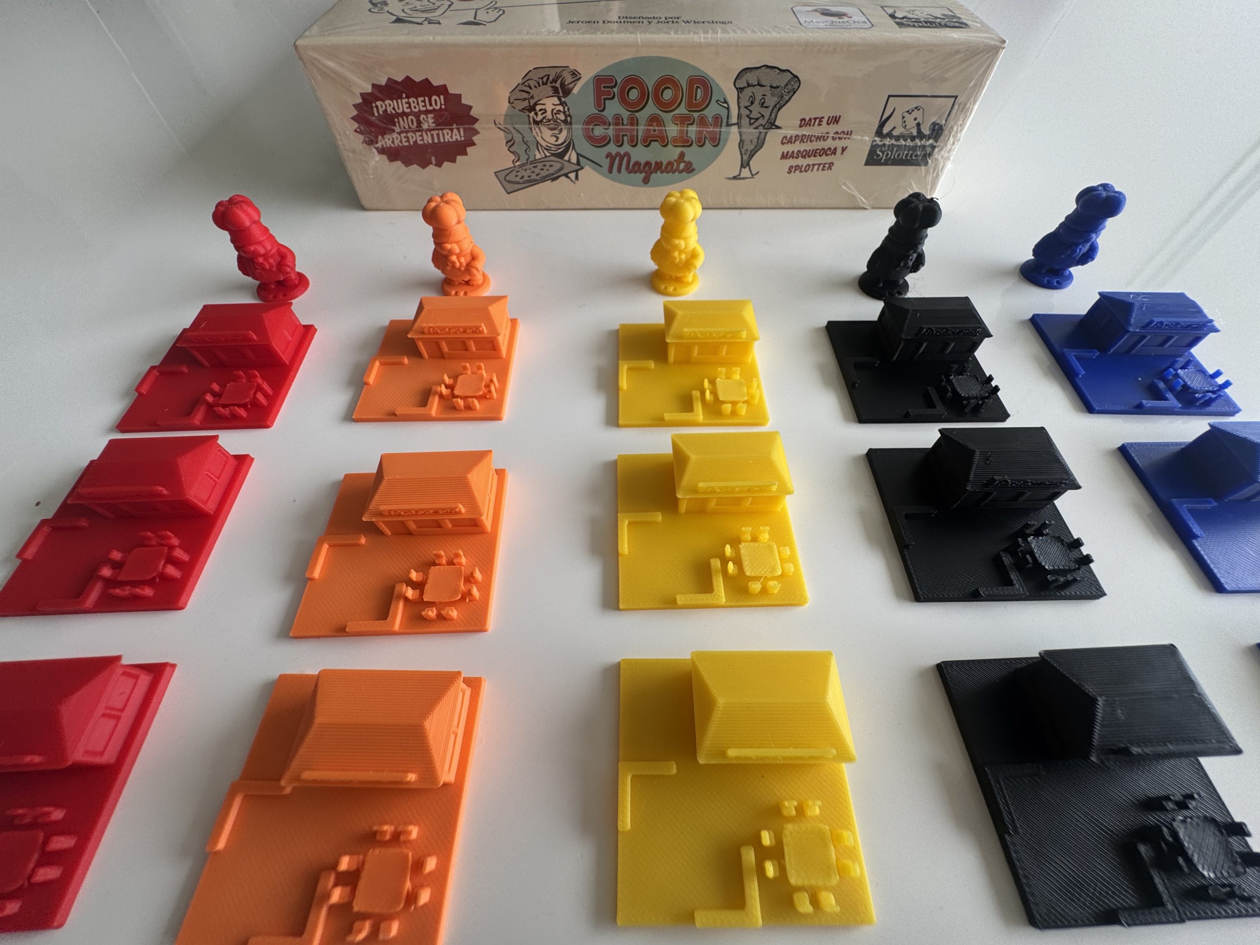 Trae 3 restaurantes por jugador en 5 colores diferentes: amarillo, naranja, rojo, azul y negro.