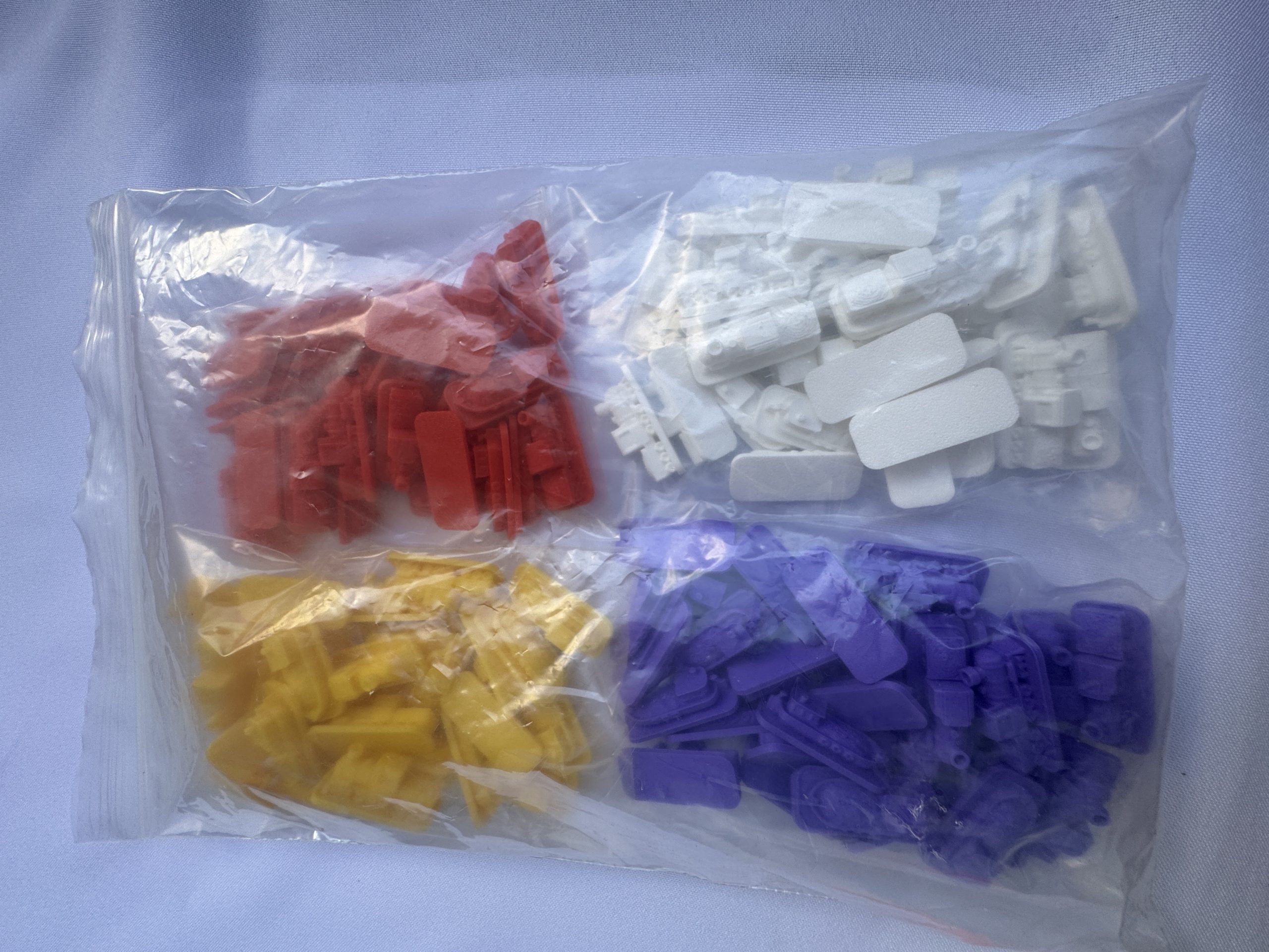 Incluye 120 piezas en total, distribuidas en 4 colores, con 15 barcos y 15 trenes por jugador.