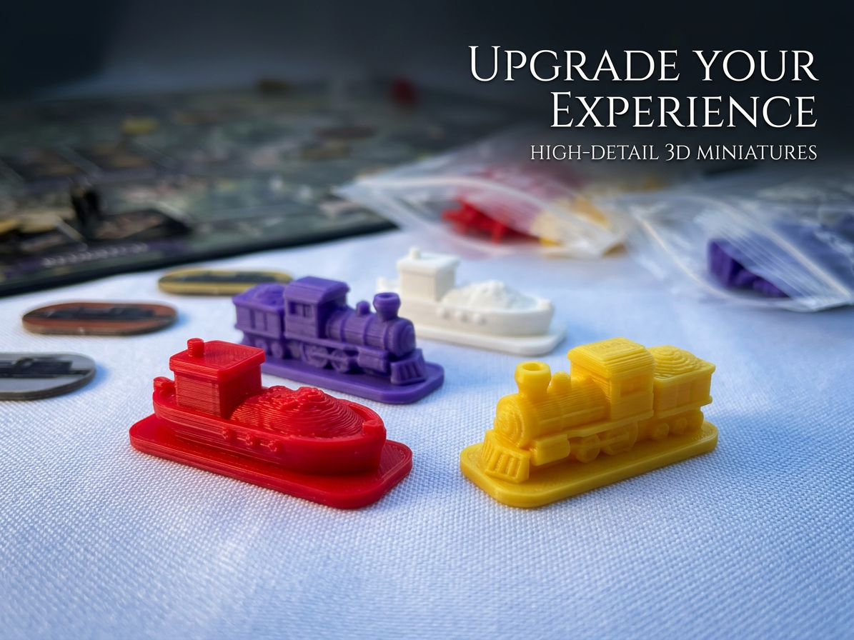 Reemplazar los marcadores estándar de Brass: Birmingham por barcos y trenes 3D, mejorando la estética del juego y haciendo que tu red de transporte luzca mucho más inmersiva sobre la mesa.