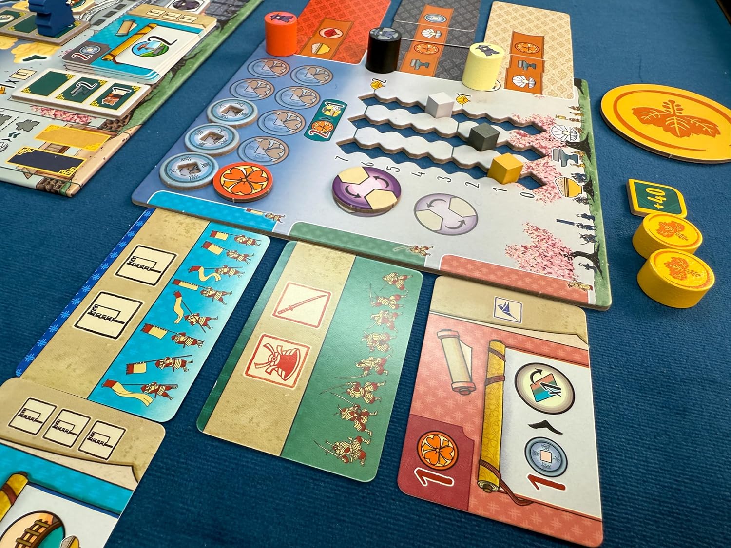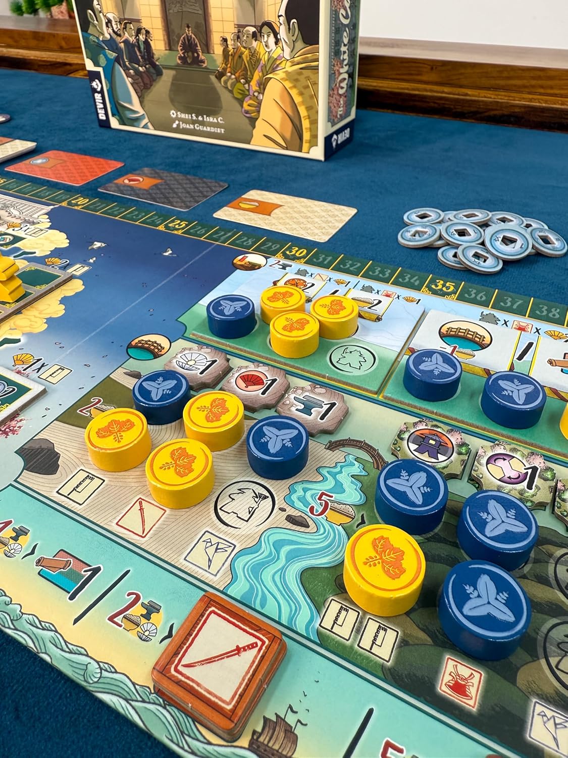 La experiencia gira alrededor de un tablero central, tableros personales con lámparas, cilindros de acción, cartas, sellos de clan y fichas de mercancía/influencia que te permiten crear combinaciones y distintas rutas de puntuación. Es una caja pensada para ofrecer un duelo estratégico compacto, pero con bastante profundidad.