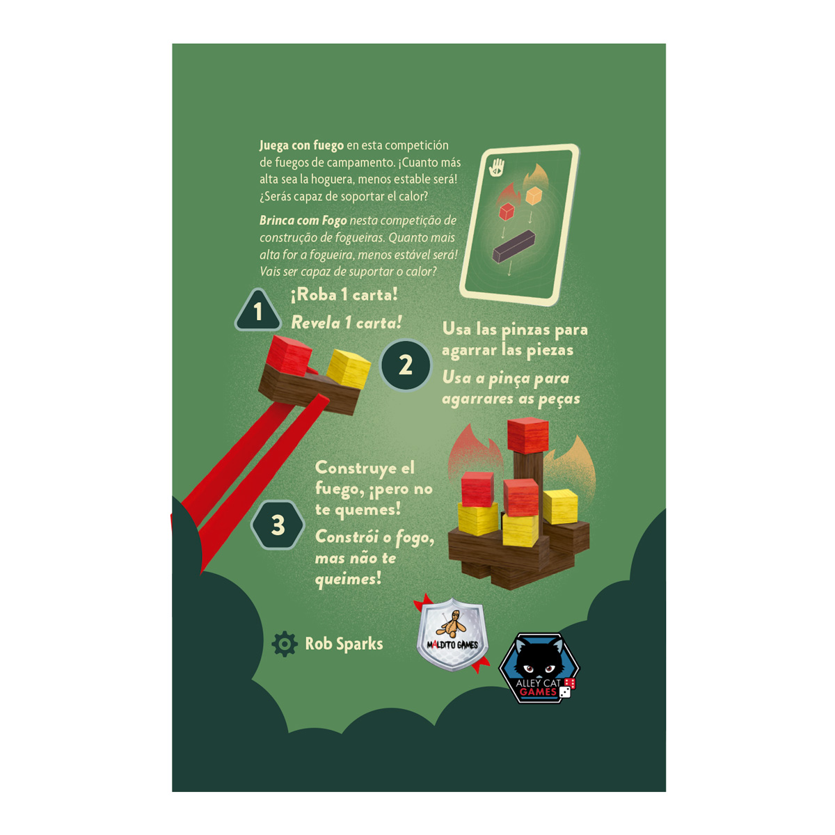En tu turno, roba una carta del mazo de fogatas que indica cómo colocar bloques sobre la fogata. Usa tus pinzas para situarlos en la posición correcta y sin derribar nada. Si dejas caer un bloque o cometes un error, ¡serás eliminado! El jugador más cuidadoso que mantenga la fogata intacta gana.