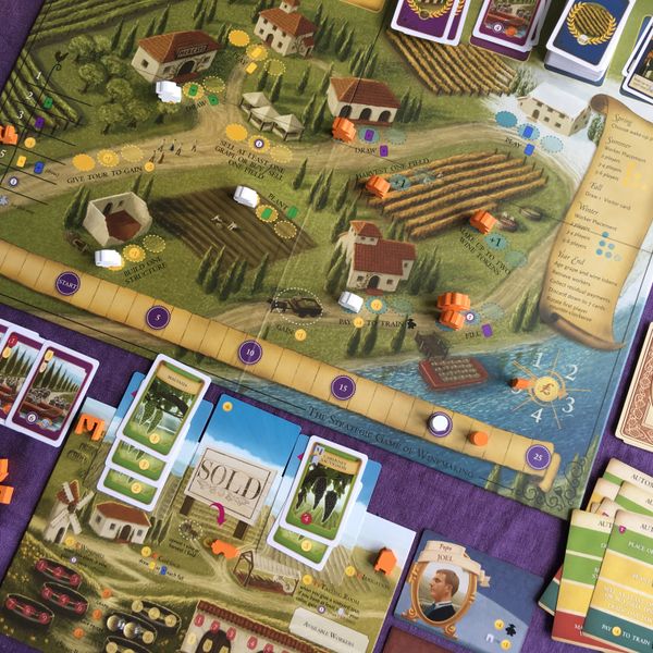 Y como si fuera poco, a la gente le encanta visitar bodegas: llegan visitantes (cartas) que pueden darte empujones estratégicos enormes… siempre y cuando asignes a alguien para atenderlos. Sus ayudas son breves, pero pueden cambiar la partida.