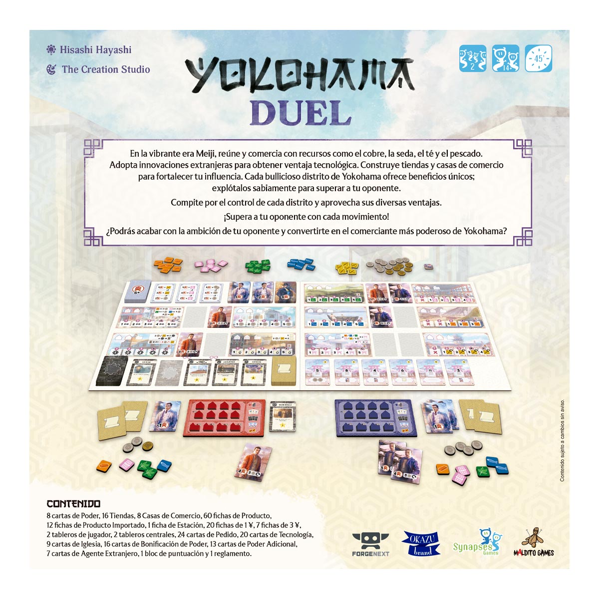 En Yokohama Duel, tú y tu rival compiten cara a cara por dominar este mercado emergente. Cada decisión cuenta: moverte por los distritos correctos, activar sus ventajas en el momento justo y construir un imperio comercial más eficiente que el de tu oponente.